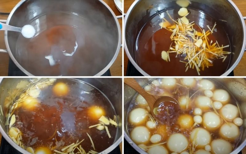 Luộc bánh trong nước sôi đến khi bánh nổi lên, vớt ra thả vào nước lạnh. Tiếp theo, nấu một nồi nước đường với lượng ngọt vừa phải, cho bánh vào, thêm gừng thái sợi, đun sôi nhẹ rồi tắt bếp.